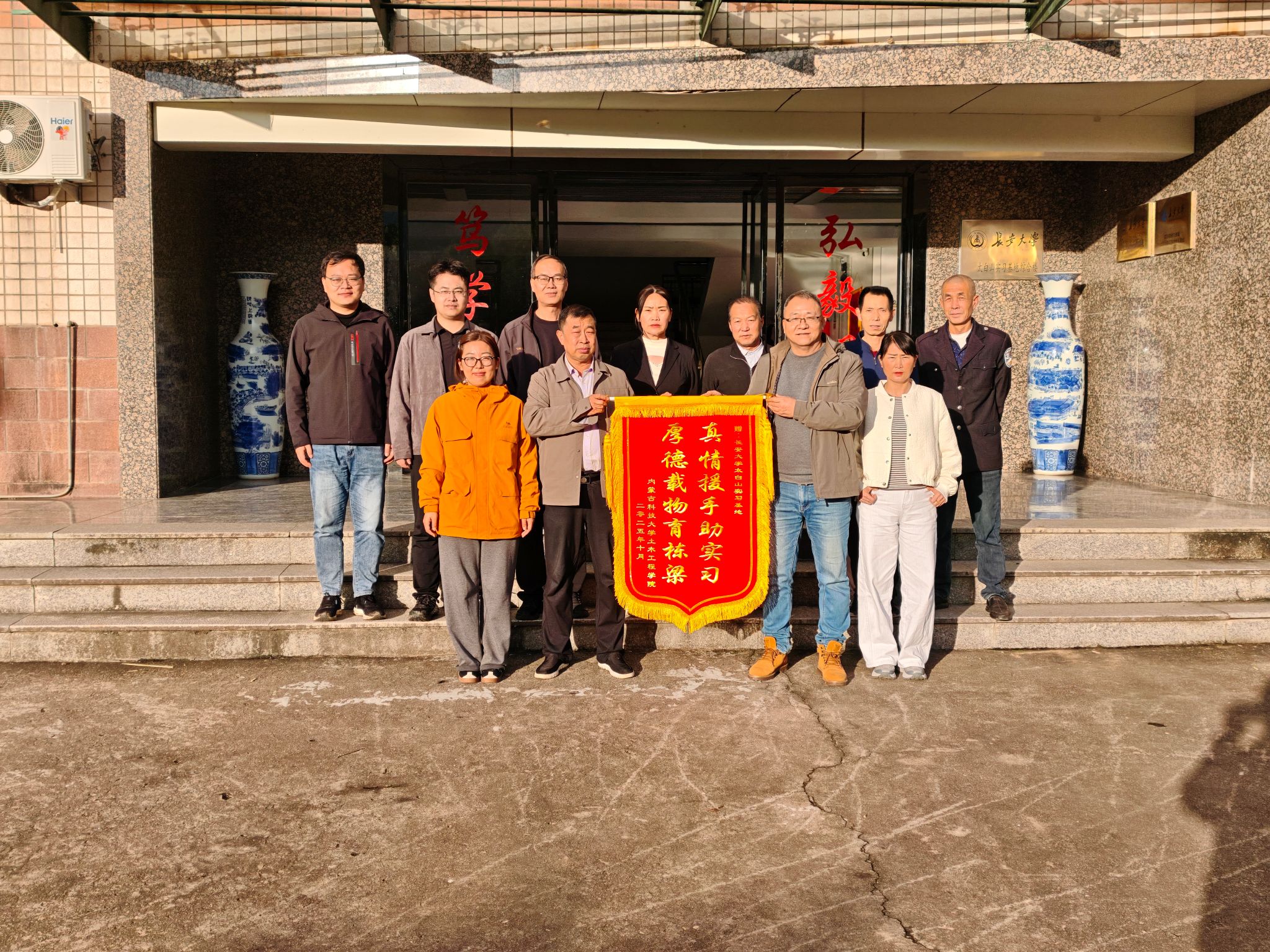 实习期间,长安大学太白山实习基地始终给予全方位支持,不仅提供贴合工程实际的勘测场地,基地工作人员还主动分享当地地形地貌对道路建设的影响,为学子们补充实践经验。为表达对基地多年来支持专业实践教学的感谢,实习尾声,交通工程系尹娟老师和韩鑫老师代表伟德bv1946将印着“真情援手助实习,厚德载物育栋梁”的锦旗赠予基地,锦旗上的文字既是对基地助力的诚挚致谢,也是对双方产教融合成果的生动见证。